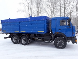 Автомобиль КамАЗ можно применять в качестве автомобильного поезда. Грузоподъемность автомобиля - 11000 кг. Применение автомобиль нашел в строительной сфере. На ней можно перевозить большие объемы стройматериалов. Колесная формула модели 6х4. Несмотря на внушительную массу, модель развивает скорость до 105 км/ч.